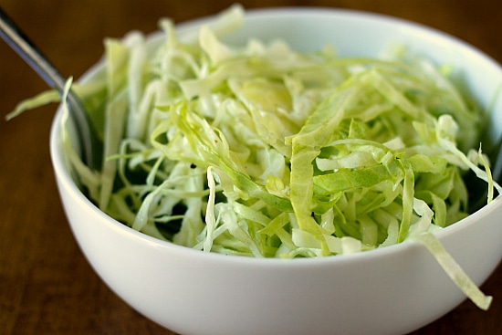 1 cup med. head cabbage, cored and shredded 1 med. onion, finely sliced 1/4 cup shredded carrot (optional, I rarely use it unless I want to add some color) 3/4 cup white granulates sugar