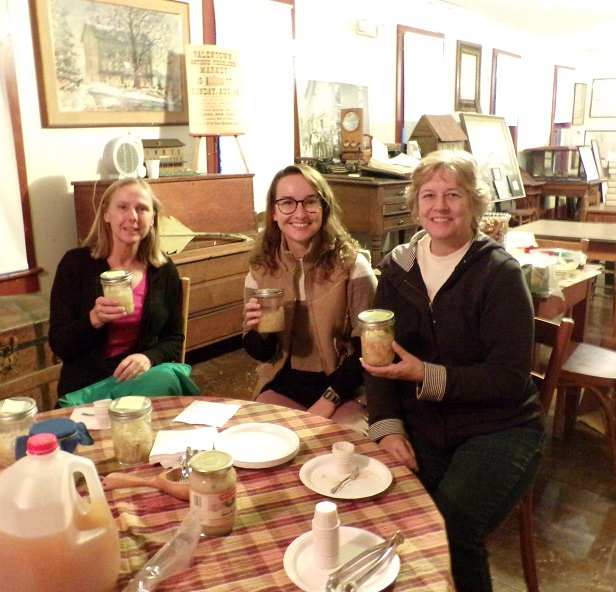 We started out with the first part of the "workshop" portion, and then moved on to tasting and comparing, with some pretzels and fresh apple cider. We tasted plain kraut, and kraut with onion and carrots. We also tasted dill, caraway, and hot red pepper flavored krauts. And we taste compared the home made to the store bought. (Store bought lost "big time".) We're very proud to say that one of our attendees who didn't like sauerkraut was converted!! Yay for home made sauerkraut! Then we moved back to the second part of the "workshop" portion to finish our batch of kraut and have a question and answer session.