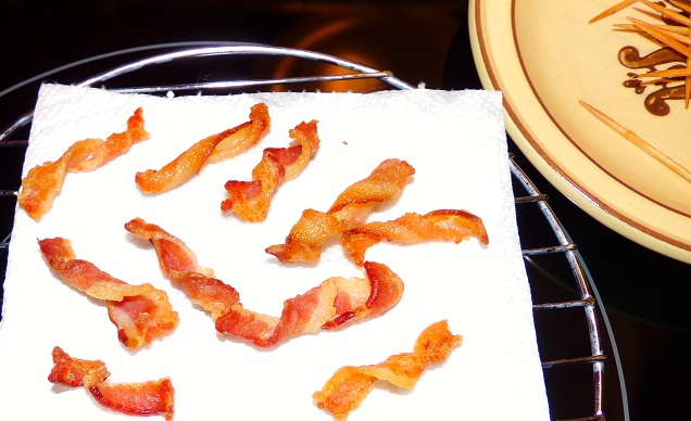 5) Drain them on paper towels. Once they are cooled, get the bacon curls off the tooth picks by gently and persistently twisting the toothpicks until they are loose, then slide the curls off.