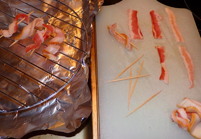 1) Remove excess fat from bacon strips, then cut them first length wise, and then cut the lengths in half.
