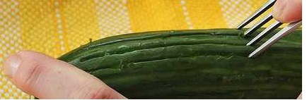 Scoring a cucumber: Use a fork to score the length of the cucumber(s) all around.